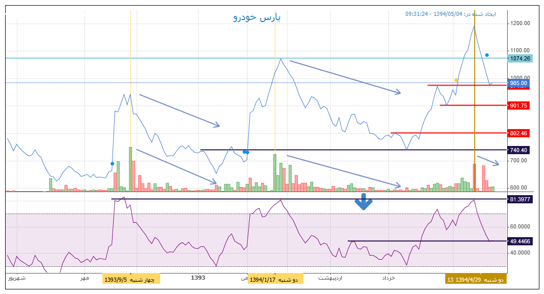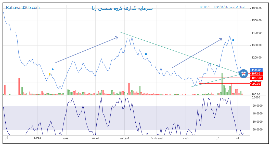سرمایه گذاری رنا با بتای 2.21 جزو پر ریسکهای بورس هست. 3 شرکت سایپا ، نیروی محرکه و ایران خودرو از سهامهای اصلی این شرکتند. NAV این شزکت بسیار بالاتر از قیمت فعلی هست اما به دلیل EPS پایین در این قیمتها معامله میشود. در نمودار روزانه سهم یک هم پوشانی در 106 دیده میشود. در نمودار بلند مدت ماهانه ی سهم روند سهم را صعودی میبینیم . در نمودار کوتاه مدت سهم حمایتها و مقاومتها مشخصندمقاومتها 114 121 و130 .103 و 99 خریدهای بسیار مناسبی با حد ضرر 95 به نظر می آیندد.RSI و MACD و R W در نزدیکهای کف هستند.